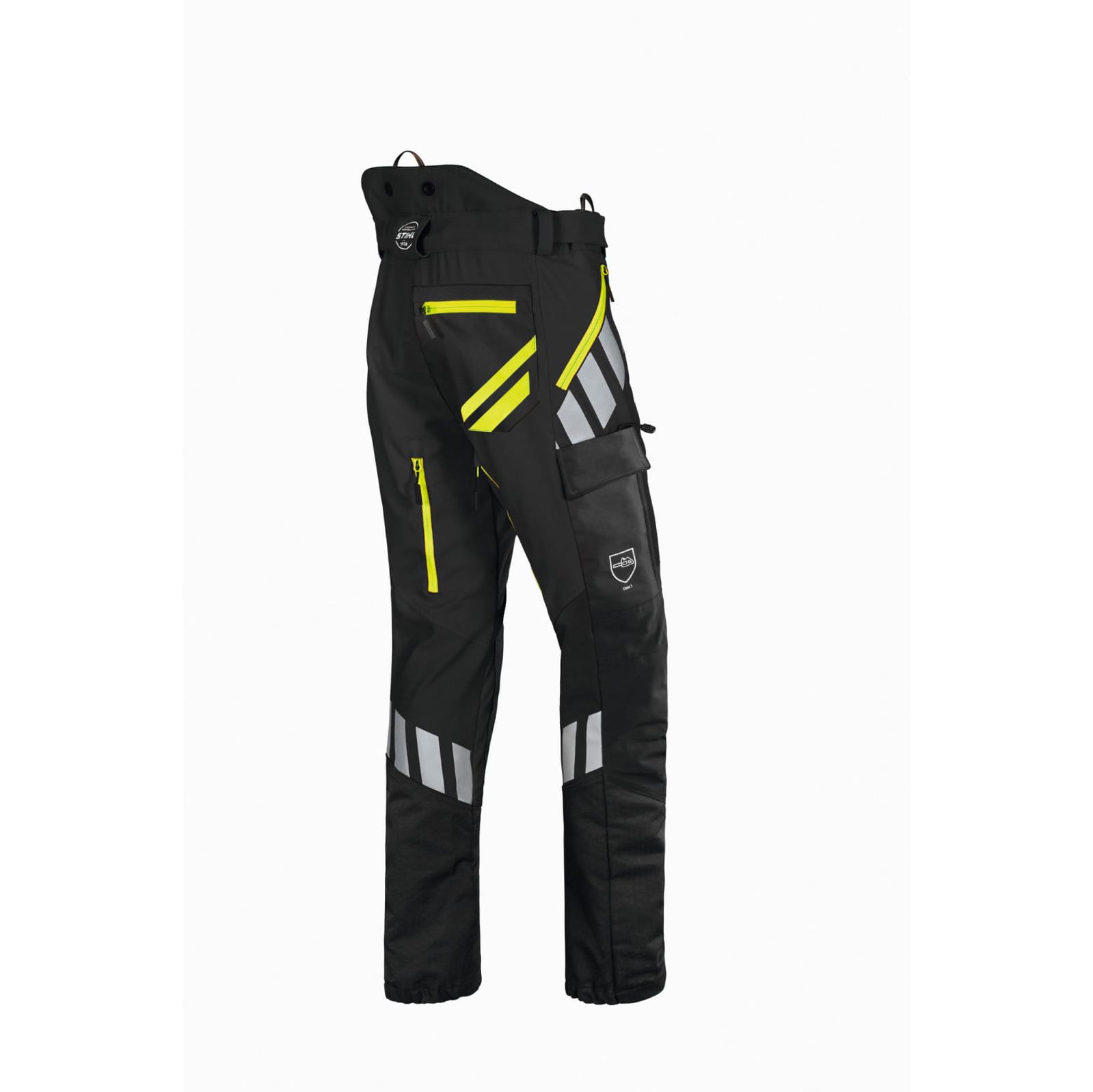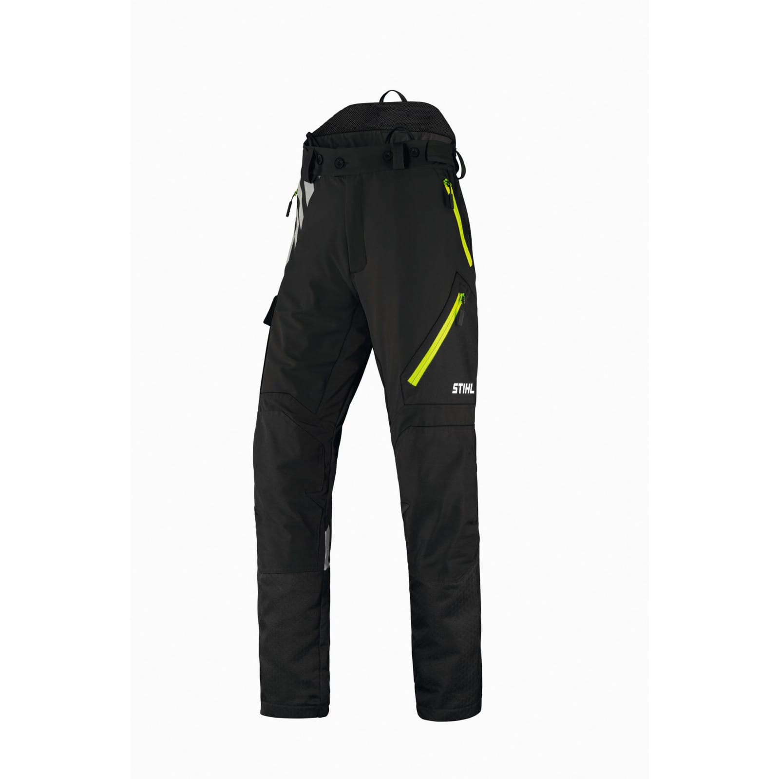 The trousers have large reflective silver stripes, and neon green accents on the pocket. You can attach STIHL braces to the ADVANCE FlexTEC trousers thanks to the buttons and loops on the waistband. You can quickly and securely adjust the waist thanks to the Velcro adjustment – and the high proportion of elasticated material used on the trousers makes them equally suitable for both male and female wearers. Two side pockets are easily accessible, and the trousers also have a back pocket, thigh pocket and a ruler pocket – meaning there is plenty of space for gloves and other accessories. All pockets are equipped with a flat zip closure to prevent resinification of the zip teeth.
